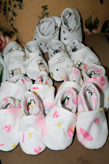 The little shoes are super cute. I used the scraps from the pants to put them together. They are small size for about 6 months old but I am going to try and adjust it to make it for older children maybe up to 2 or 3. They were a little more difficult to make then the pants but after I get the girls going on the pants I'm going to get them making the shoes too.